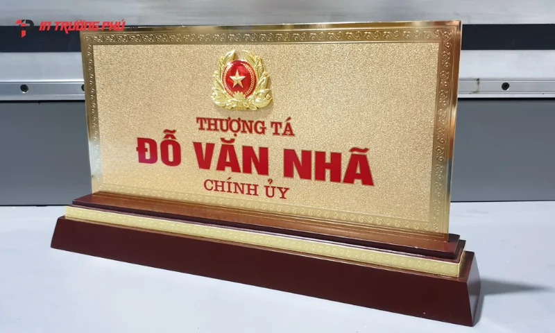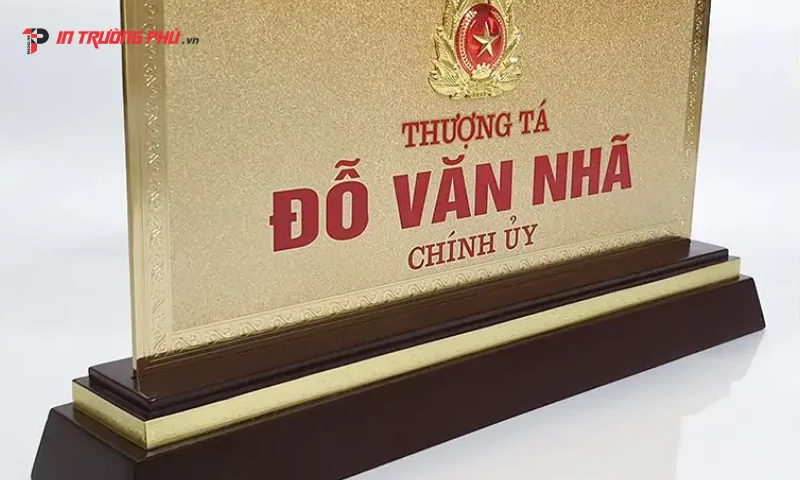 Biển chức danh mặt đồng đế gỗ là vật phẩm giúp nâng tầm uy tín lãnh đạo và tạo ấn tượng chuyên nghiệp ngay từ cái nhìn đầu tiên. Tại In Trường Phú, sản phẩm được chế tác từ đồng nguyên chất dày 1ly kết hợp đế gỗ tự nhiên xử lý chống mối mọt, ứng dụng khắc ăn mòn điện hóa cho chữ/logo sắc nét, bền vĩnh viễn. Bề mặt được phun sơn chuẩn màu và phủ bóng 2K chống oxy hóa, chống trầy, dễ vệ sinh. Quy trình đặt làm nhanh gọn gồm tư vấn – thiết kế demo miễn phí – gia công – kiểm tra chất lượng, đảm bảo thành phẩm sang trọng, bền đẹp theo thời gian.