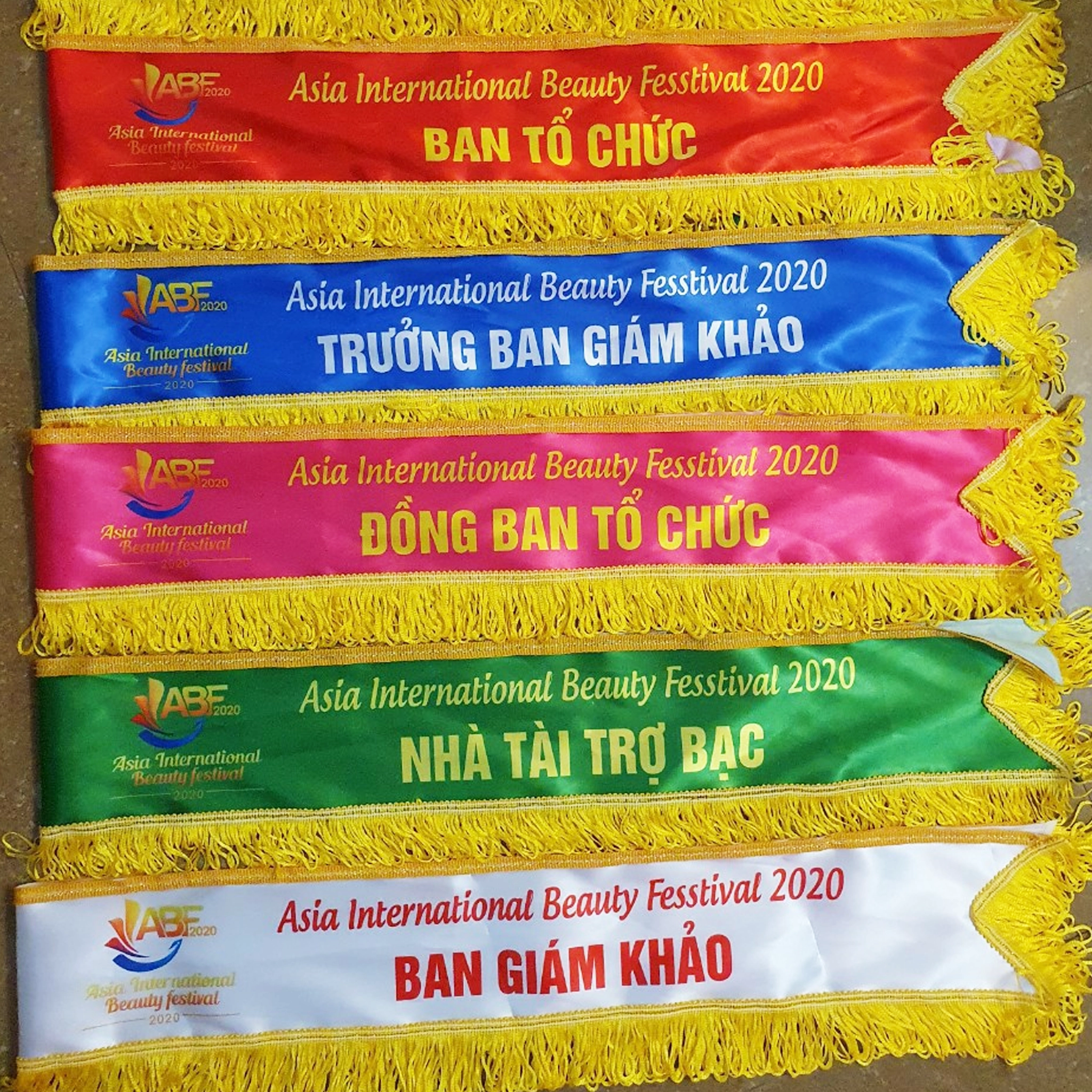 | Băng đeo chéo – Băng đeo Hoa Hậu – Sash hoa hậu – Băng đeo cho PG loại in 2 - 3 màu - Kích thước: Rộng 12 x dài 180 cm - Chất liệu: Vải phi Kaki - Công nghệ : In lưới 2 - 3 màu mực - Yêu cầu : Máy viền - Thời gian: 3 đến 5 ngày - Giá in áp dụng cho 1 mẫu in - Giá đã bao gồm thiết kế, in ấn thành phẩm |