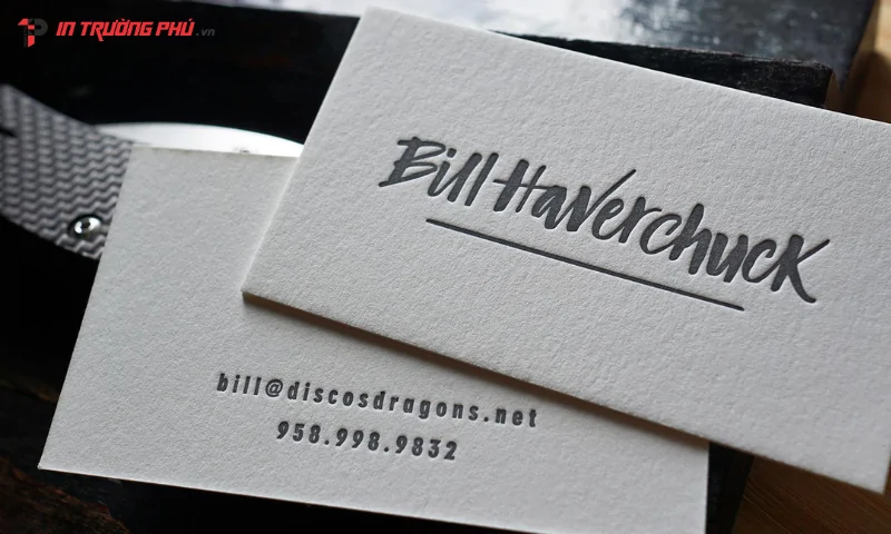 Danh thiếp dập nổi là dòng danh thiếp cao cấp, tạo hiệu ứng nổi trên bề mặt thông qua kỹ thuật ép khuôn. Loại danh thiếp này mang lại cảm giác sang trọng, thể hiện đẳng cấp và thường được lựa chọn bởi các doanh nghiệp lớn, thương hiệu cao cấp hoặc cá nhân muốn tạo điểm nhấn mạnh mẽ khi giao tiếp. Họa tiết, logo hoặc chữ được dập nổi giúp tăng tính thẩm mỹ, tạo cảm giác chạm tay độc đáo mà các loại danh thiếp thông thường khó mang lại.