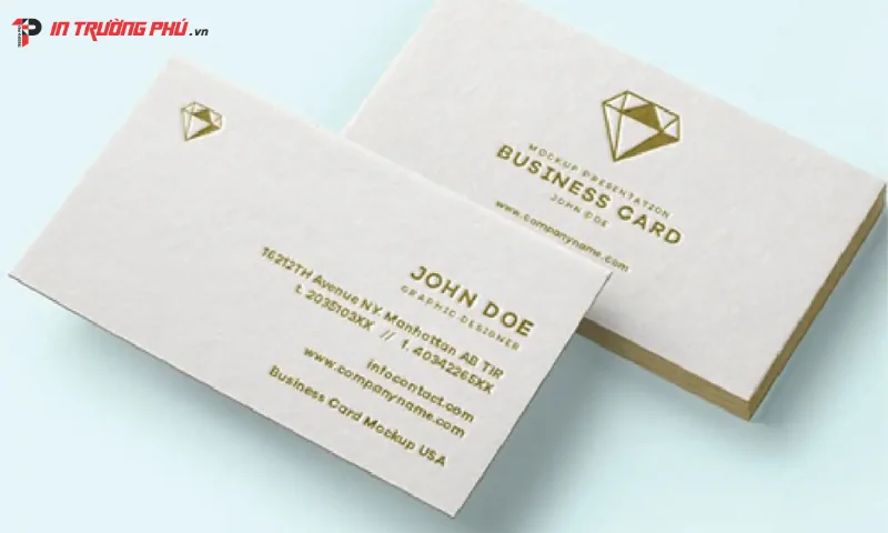 Ngoài kỹ thuật in cơ bản, In Trường Phú còn cung cấp các hiệu ứng hoàn thiện cao cấp như dập nổi, ép kim vàng – bạc – đỏ – xanh, phủ UV cục bộ hoặc cán mờ – cán bóng. Những hiệu ứng này giúp danh thiếp trở nên sang trọng hơn, tạo sự khác biệt rõ rệt so với các sản phẩm thông thường. Đặc biệt, ép kim và UV cục bộ giúp tôn bật logo hoặc thông tin quan trọng.